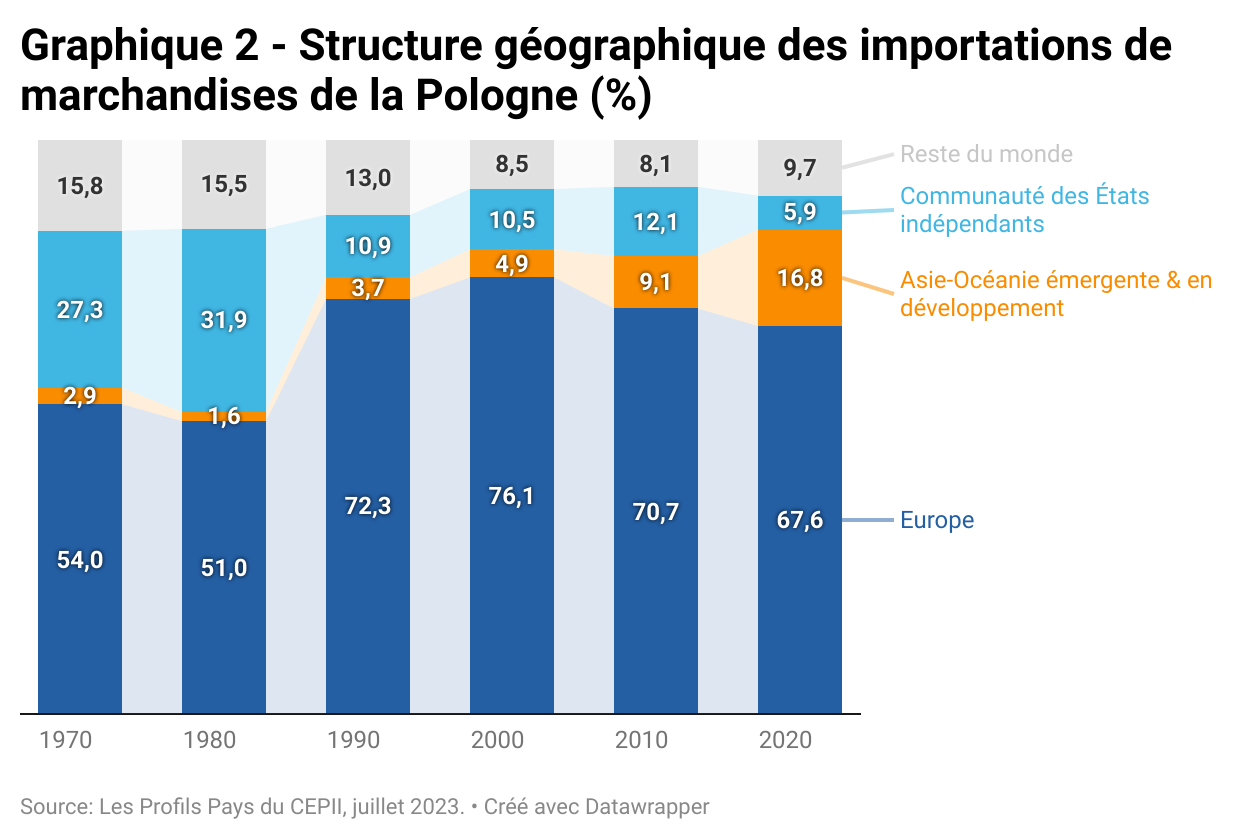 L’insertion de la Pologne dans l’économie européenne est un enjeu important pour ce pays (graphiques 1 et 2) : 83 % de ses exportations y sont destinées et 68 % de ses importations en proviennent (respectivement 28 et 24 % avec le seul partenaire allemand). Amorcée à partir de l’entrée en vigueur de l’accord d’association signé en 1992, cette insertion s’est approfondie après l’adhésion, en 2004, de la Pologne à l’UE.