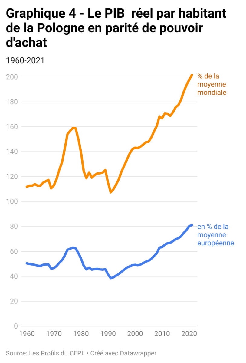 Depuis l’intégration à l’Europe, le revenu des Polonais a significativement augmenté : le PIB par tête réel du pays en parités de pouvoir d’achat s’élevait à moins de 40 % de la moyenne européenne en 2004 ; il atteint désormais 80 % de celle-ci.