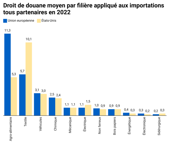 Les États-Unis et l’Union européenne (UE) appliquent des droits de douane relativement faibles en moyenne. Qu’en est-il des niveaux par filières ?
