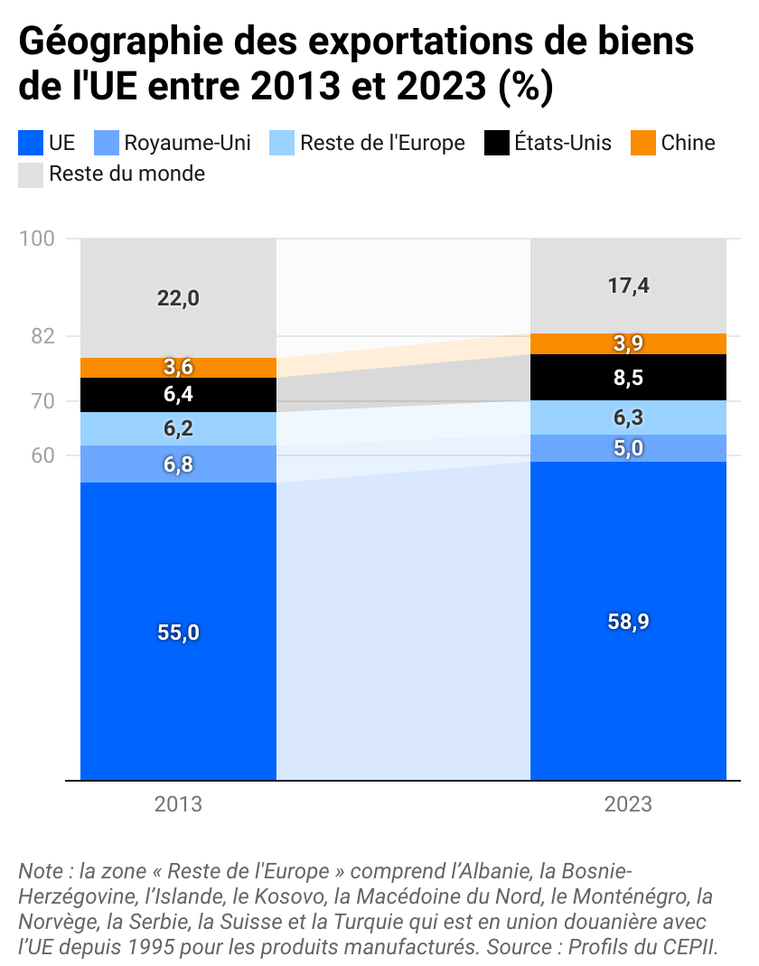 L'Europe commerce d'abord avec elle-même, et de plus en plus : les flux d’échanges mutuels des pays membres, qui représentent près de 60 % des exportations de l’UE, ont augmenté de 4 points de pourcentage (pp) sur la dernière décennie. Cette tendance au repli sur le marché le plus sécurisé tient notamment au choc du Brexit (ressenti dès l’annonce, en 2015, du référendum qui aboutira à sa réalisation complète en 2021), à la crise sanitaire de 2020 et à l’invasion de l’Ukraine en 2022.