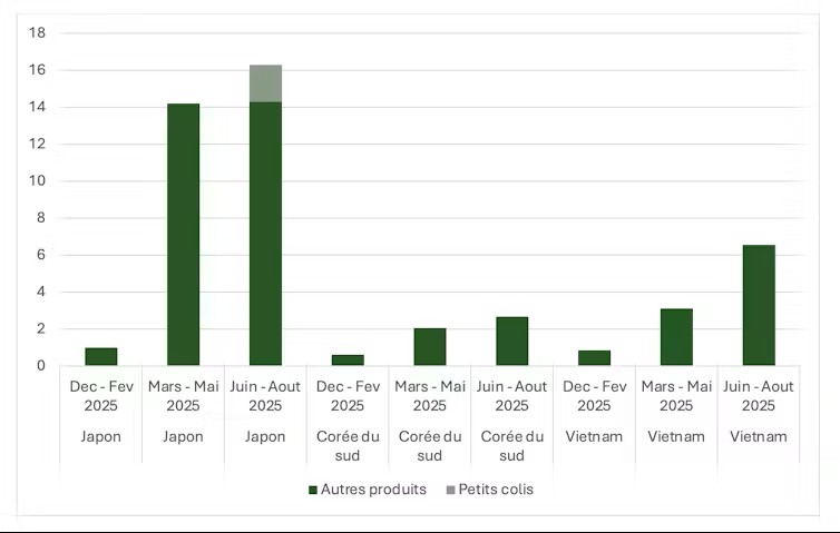 En comparaison, le Japon subit davantage la réorientation du commerce chinois puisque 298 produits sont identifiés en juin-août 2025 (graphique 5). Ces produits représentent une part beaucoup plus importante des exportations chinoises vers le Japon (16,2 % en juin-août 2025). Des dynamiques similaires sont observées en Corée du Sud (196 produits, représentant 2,7 % de son commerce bilatéral avec la Chine) et le Vietnam (230 produits, 6,5 % de son commerce bilatéral avec la Chine).