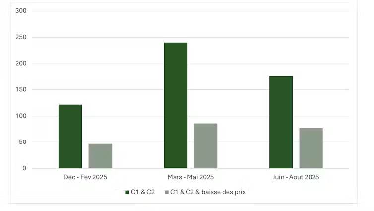En combinant les deux critères, 176 produits sont concernés en juin-août 2025 (graphique 2), soit 44 % des produits dont les ventes ont nettement chuté sur le marché états-unien. Parmi eux, 105 concernent des produits pour lesquels l’Union européenne a un avantage comparatif révélé, c’est-à-dire pour lesquels la hausse des importations se fait sur une spécialisation européenne.