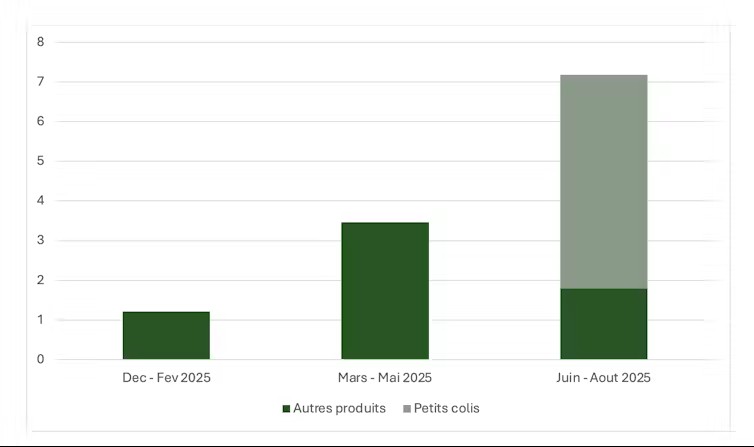 En valeur, les 176 produits identifiés représentent 7,2 % des exportations chinoises vers l’Union européenne sur la dernière période disponible, et la tendance est clairement à la hausse (graphique 3). Cette progression s’explique pour beaucoup par la hausse des flux de petits colis redirigés vers l’UE depuis qu’en avril 2025, les États-Unis ont supprimé l’exemption de droits de douane sur les colis en provenance de Chine.