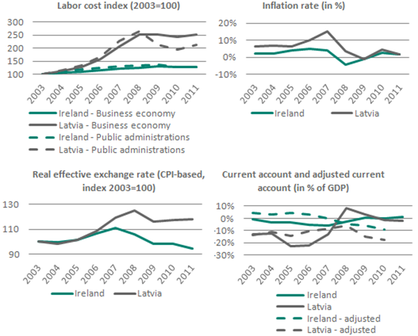 Ireland and Latvia were branded as “role models” by the European Commission because they followed such a strategy in tackling their own imbalances since 2008. These « internal devaluation » processes are however controversial: if some hailed Latvia for its alleged recovery [1], several authors raised serious doubts about its reach and pointed at the social costs of the implemented policies [2].