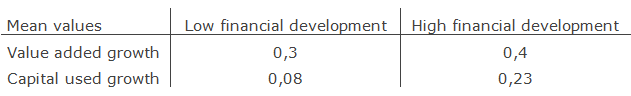 Indian states can be classified according to their level of financial development. Those states that have a growth of credit over GDP ratio between 1997 and 2006 that is higher than the median growth of credit ratio are classified as states with a high degree of financial development. While those states that have experienced a growth of credit ratio that is lower than the median are considered as low financial developed states. Table 1 shows the average growth in value added and capital investment for firms located in low- and high- financial developed states. Companies producing in states where the credit expansion was greater have experienced a higher growth.