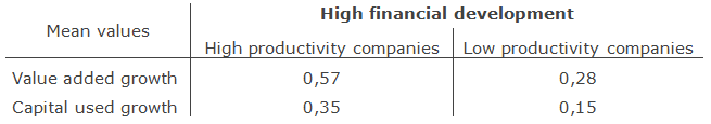 Which are the firms that have benefited most from the financial reform? In the case of India, financial development has affected companies’ production and capital investments growth differently depending on the performance of companies. Credit expansion had a greater effect on companies that were initially larger, more productive or more profitable. Table 2 shows the growth of value added and capital used for high- and low- productivity firms. High-productivity firms are those that have a TFP level in 1997 that is higher than the median TFP, and low-productivity firms are those that present a TFP level in 1997 that is lower than the median sample TFP. This table shows that most productive companies located in high financial developed states have experienced a greater growth of value added and capital used relative to least productive firms.