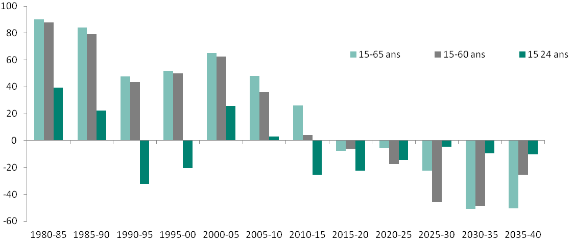 Chine: changement dans la population d'âge actif de 1980 à 2040, par périodes de 5 ans (en millions)