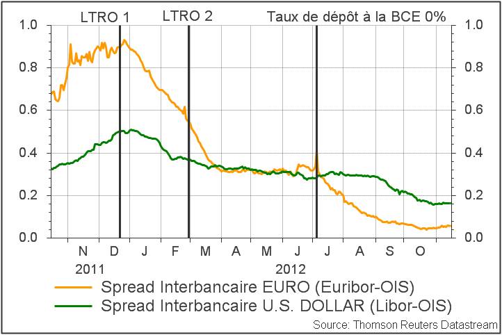 Restaurer le bon fonctionnement des marchés interbancaires était un des objectifs clés lors de la prise de fonction de Mario Draghi à la BCE. Un an et deux LTRO plus tard, cette mission semble accomplie.