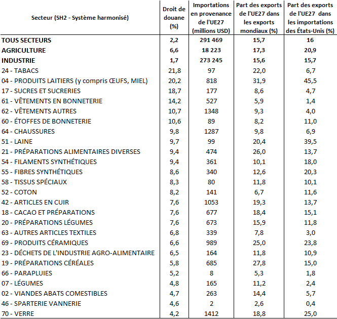 Tableau 1 - protection douanière appliquée par les Etats-Unis aux importations en provenance de l’UE27 (équivalent ad valorem en %) et commerce correspondant (en millions de dollars), 2010.