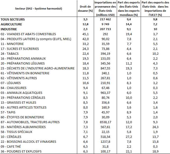 Tableau 2 - protection douanière appliquée par l’UE aux importations en provenance des Etats-Unis (équivalent ad valorem en %) et commerce correspondant (en millions de dollars), 2010.