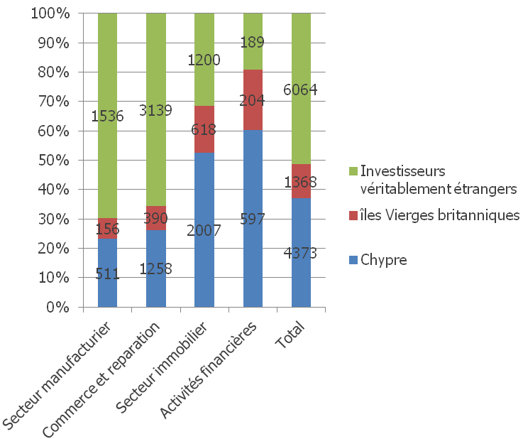 Il existe peu de preuves directes sur la corruption et le blanchiment d'argent. Le secteur bancaire chypriote est opaque, une qualité qui le rend très attractif en tant que centre financier offshore. Cependant, la recherche universitaire fournit quelques preuves indirectes. Dans un article récent publié au CEPII, Ledyaeva et al. (2013) analysent des données sur 20 000 entreprises étrangères en Russie durant la période 1997-2011. Les auteurs distinguent deux types d'entreprises. Le premier groupe est constitué d’entreprises étrangères détenues par des investisseurs Chypriotes ou des Îles Vierges britanniques, considérés comme des investissements russes masqués grâce à ce procédé d’ « aller-retour ». Le deuxième groupe est constitué d’entreprises étrangères détenues par de véritables propriétaires étrangers qui sont enregistrés principalement en Allemagne, aux Etats-Unis, en Finlande, en Chine, en Turquie, en France et en Suède.