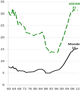 Graphique 1 Evolution 1960-2012 du PIB par tête Birmanie en % du Monde et de l’ASEAN (prix et PPA 2005) |