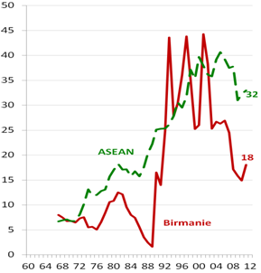 L'isolement international de la Birmanie depuis les années 1960 a mené le pays à focaliser ses relations économiques extérieures sur quelques voisins. Ces dépendances la rendent vulnérable aux chocs : sur la période 2000-2007, la Birmanie a enregistré une croissance annuelle moyenne de 12,8 %, la plus forte au sein de l’ASEAN (Tableau 1), mais, depuis la crise globale qui a fortement affecté l’économie thaïlandaise, la croissance birmane a nettement ralenti (5,1 % par an sur 2007-2012). Il n’en reste pas moins que le positionnement géographique de la Birmanie au sein de la zone la plus dynamique de l’économie mondiale est un facteur décisif de son rattrapage économique.
