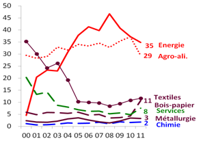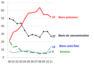 La concentration de ses exportations sur un nombre très limité de produits et de partenaires est à l’origine de ces fluctuations. Les produits primaires représentent 52 % des exportations birmanes. Cette grosse moitié est constituée aux deux tiers de gaz naturel. Viennent ensuite le bois (18 %), les produits agricoles (8 %) et miniers (7 %) (Graphiques 3 et 4). La quasi-totalité des ventes énergétiques est destinée à la Thaïlande qui constitue le principal marché de la Birmanie (39 % des exportations totales, presque exclusivement dans la filière énergétique, Tableau 2). Les exportations de produits agro-alimentaires qui représentent 29 % des ventes birmanes sont principalement destinées à l’Inde (15 %) et à la Chine (6 %). Cette dernière est le principal fournisseur de la Birmanie : 40 % de ses importations en provenaient en 2011. La Birmanie achète à la Chine dans toutes les filières, particulièrement dans celles de la mécanique, des véhicules et de la métallurgie. Le poids des importations birmanes issues de Chine a doublé durant la décennie 2000. Corollaire : une sensible diminution des parts relatives des pays fournisseurs à haut revenu de la région (Singapour, Japon et Corée du Sud).