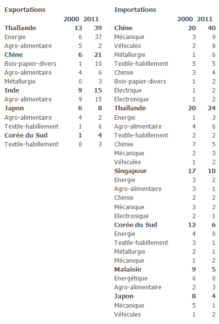 Tableau 2 - Principaux partenaires commerciaux de la Birmanie et le contenu par filière des échanges
