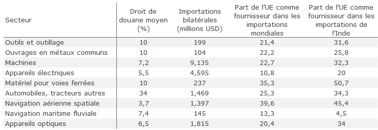 Tableau - Protection douanière et importations de l’Inde dans une sélection de secteurs industriels en 2010