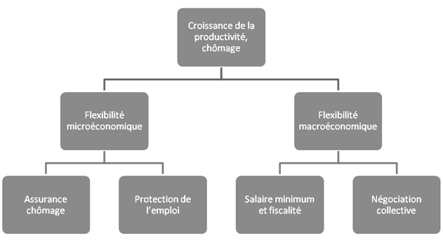 Le schéma 1 synthétise la grille d’analyse du marché du travail proposée dans cette Staff Discussion Note. De bas en haut, les institutions sur le marché du travail déterminent la flexibilité du marché du travail et ensuite la capacité de l’économie à atteindre une forte croissance de la productivité et un chômage faible. Les auteurs distinguent la flexibilité microéconomique (portant sur la capacité du marché du travail à réallouer les travailleurs des entreprises en déclin vers celles en expansion) de la flexibilité macroéconomique (portant sur la capacité du marché du travail à réagir aux chocs macroéconomiques), chacune étant déterminée par des institutions spécifiques (assurance chômage, protection de l’emploi, salaire minimum et fiscalité, négociations collectives, cf. schéma 1).