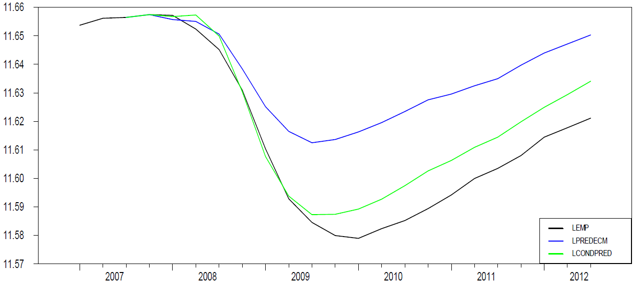 Les données sont exprimées en logarithmes. A partir de la fin 2009, l’écart de l’ordre de 0,01 entre emploi observé et modélisé (noir-vert) signifie que le niveau observé est environ 1% en-dessous du niveau modélisé.