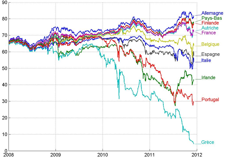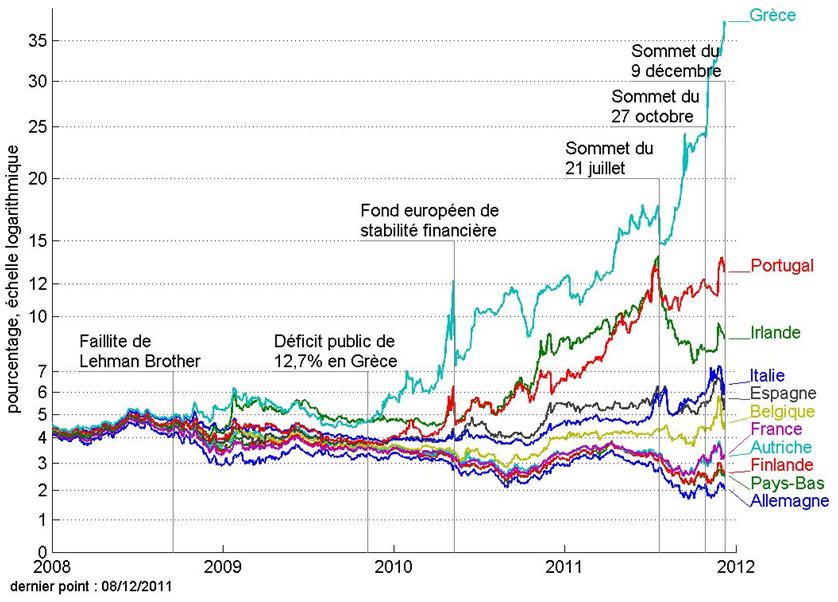 Depuis la crise financière de 2008, la situation sur le marché obligataire n’a cessé de se dégrader en zone euro, les taux d’intérêt de la Grèce d’abord, du Portugal, de l’Irlande ensuite, de l’Italie, de l’Espagne et de la Belgique enfin ont fortement augmenté relativement aux taux des pays de référence (Allemagne, Pays-Bas, Finlande, France et Autriche). Ces hausses de taux représentent à la fois une augmentation du coût des emprunts des Etats et des pertes de valeur du portefeuille des institutions financières.