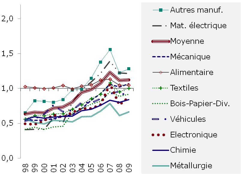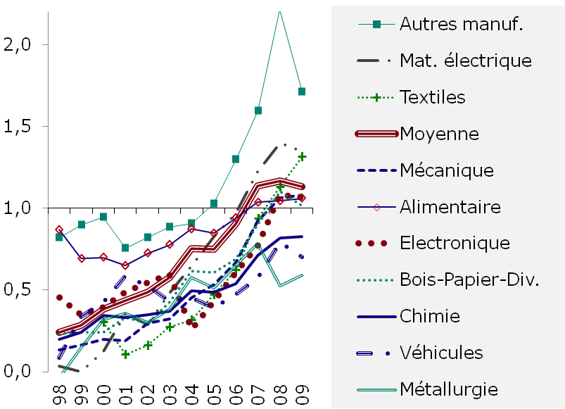 Graphiques 1 - Le rattrapage de la zone intérieure dans les industries manufacturières Zone côtière = 1 |