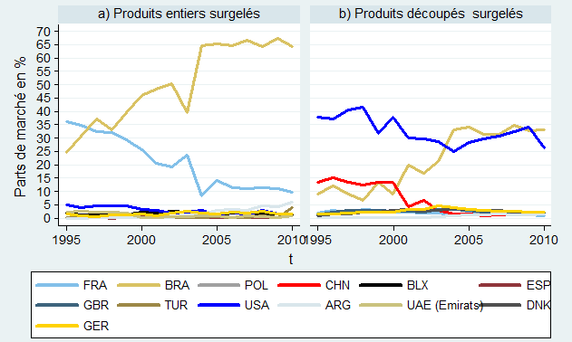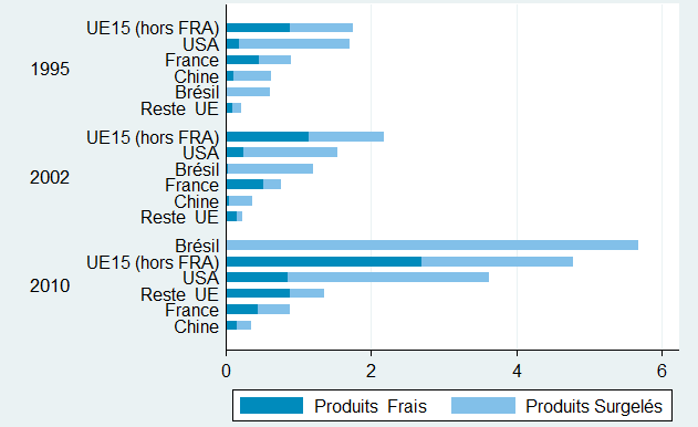 Concernant les produits surgelés, deux pays se disputent les parts de marché dans chaque filière : la France et le Brésil dans les produits congelés entiers ; Les États-Unis et le Brésil dans les produits découpés. Le Brésil, grand gagnant sur ces deux marchés ces dernières années, occupe désormais 60 % du marché mondial des produits entiers surgelés, au détriment des États-Unis et de la France (qui a vu ses parts de marché fondre de 30 % à 10 %).