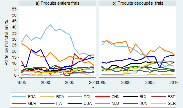 Afin de mieux comprendre l’évolution des performances françaises, nous considérons quatre marchés distincts : le marché des produits frais entiers ; celui des produits frais découpés ; le marché des produits surgelés entiers et enfin, celui des produits surgelés et découpés. Les graphiques 3 montrent ainsi l’évolution des parts de marchés correspondantes dans le monde.