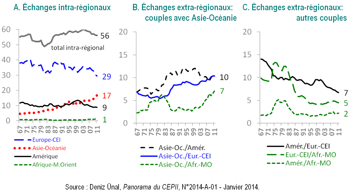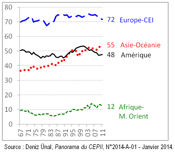 Ce billet est extrait de « La géographie du commerce mondial, 1967-2011 », Panorama du CEPII, D. Ünal, n°2014-A-01, janvier 2014.
