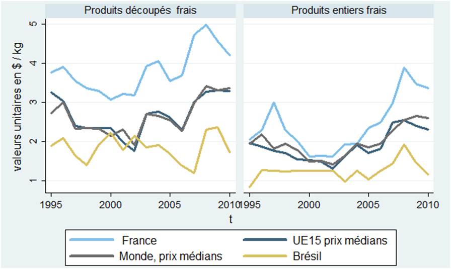 [1] Il s’agit de séries de valeur unitaire ($/kg) calculées par les auteurs en divisant des données de valeur (milliers de dollars) par le volume observé (tonnes), et en nettoyant la base de certaines valeurs aberrantes.