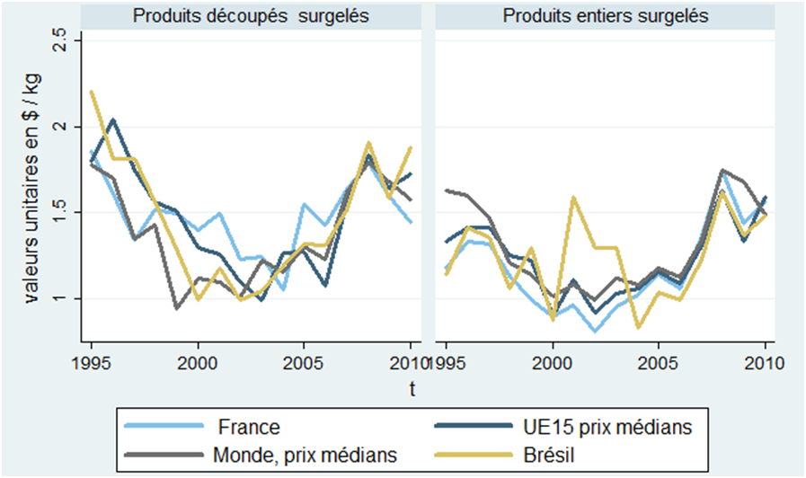 Dans le surgelé, les prix apparaissent très similaires quel que soit le pays. L’ensemble des pays considérés semble contraint de s’aligner sur le prix le plus bas relevé, celui du Brésil, à cause d’une très forte concurrence et d’un produit peu différencié. Ainsi, les producteurs doivent, au-delà des subventions qu’ils reçoivent, comprimer leurs marges. Ils doivent également inciter leurs travailleurs à être plus productifs tout en modérant leurs salaires dans l’espoir de réussir à maintenir des coûts unitaires suffisamment bas et préserver l’activité et l’emploi.
