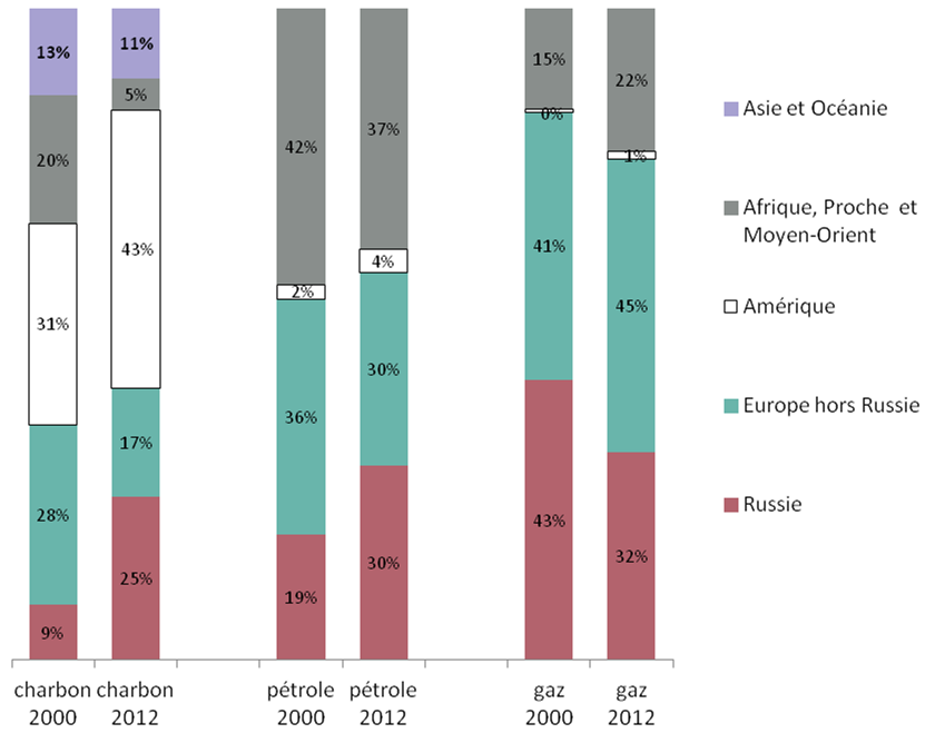 En matière de gaz naturel, les positions des pays européens vis-à-vis de la Russie ne sont pas équivalentes : le Royaume-Uni et l’Espagne reçoivent une partie de leur gaz sous forme liquéfiée par bateau alors que l’Allemagne et les pays de l’est de l’Europe sont fournis par gazoduc principalement en provenance de Russie. Le Royaume-Uni importe son gaz de Norvège par pipeline et du Qatar sous forme liquéfiée. En 2012, cette dernière source s’est contractée avec la hausse des prix liée à la demande asiatique. L’Espagne se fournit auprès de l’Algérie.
