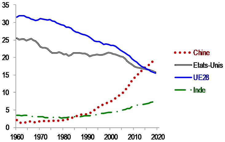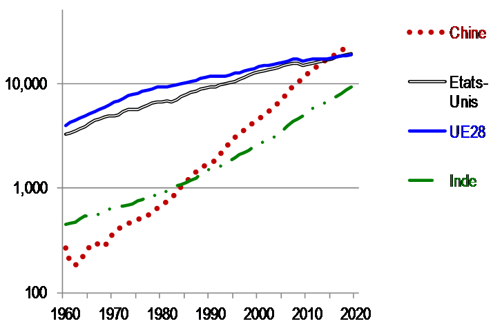 A peu de chose près, l’année 2014 correspond de fait à la convergence de la taille réelle des économies de l’UE28, des Etats-Unis et de la Chine, chacun comptant pour 17%, soit environ un sixième, de la valeur ajoutée mondiale exprimée en PPA (graphique 2). L’Inde, quatrième, ne représente que 6,6% du total mondial en 2014.