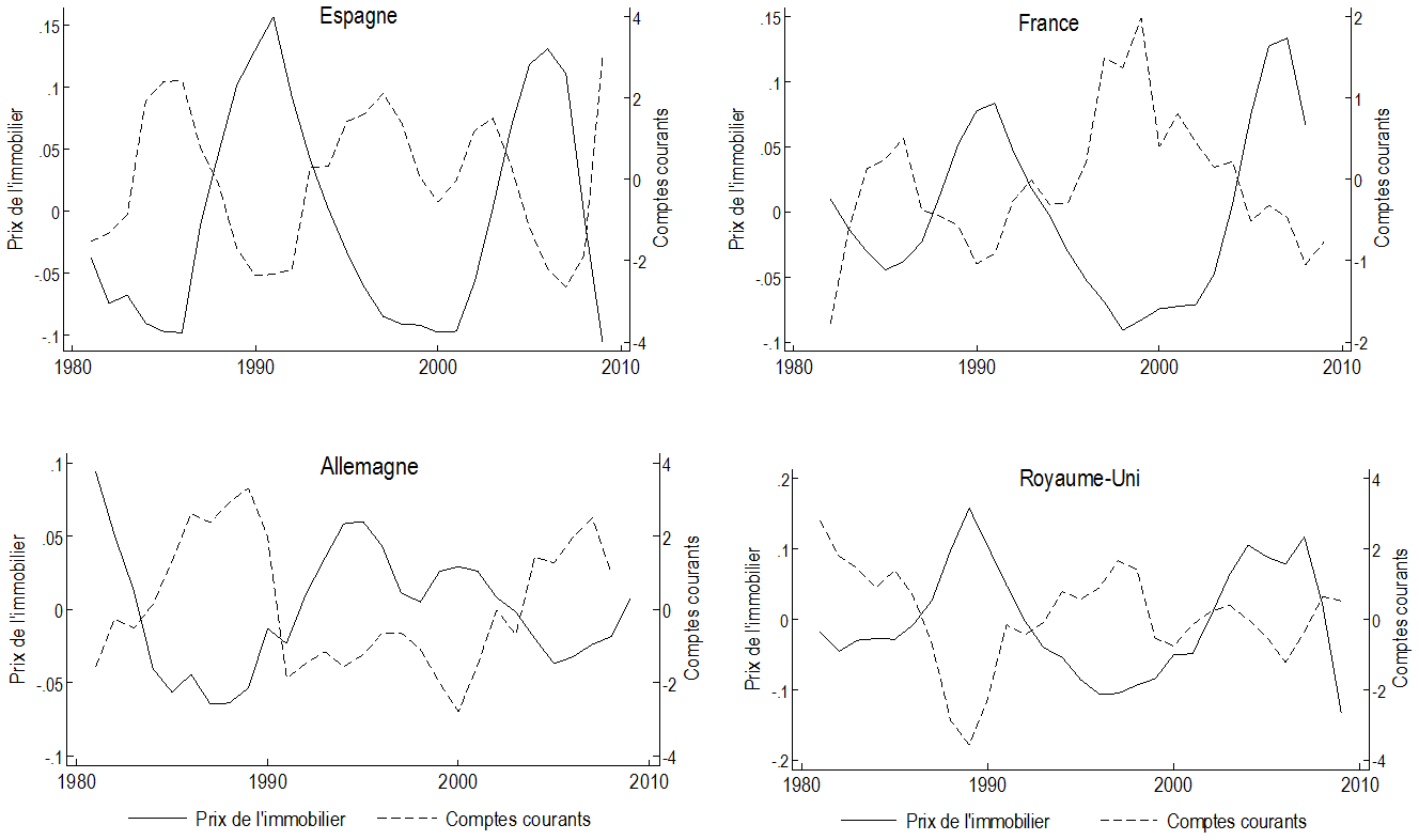 Dans un article récent, Geerolf et Grjebine (2013) ont montré que les prix de l’immobilier étaient un déterminant important des évolutions des comptes courants des pays de l’OCDE, non seulement lors du dernier boom immobilier mais également sur les 40 dernières années. Les auteurs calculent qu’une augmentation de 10 % des prix de l’immobilier cause une dégradation des comptes courants de 1,7 % du PIB.