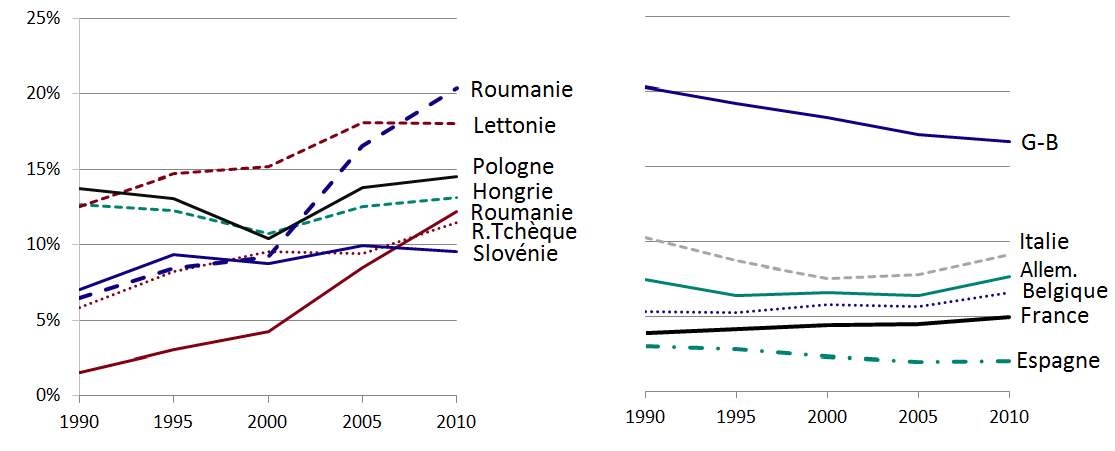 En moyenne le taux d’émigration des personnes qualifiées [5] des nouveaux pays de l’UE (NPE) est passé de 11 % en 2000 à 16 % en 2010 (contre une moyenne d’à peine 8 % dans les Vieux pays européens représentés sur le graphique 1). En 2010, les taux d’émigration des qualifiés les plus élevés parmi les NPE ont été constatés en Estonie (33,4 %, non représentée ici), en Roumanie (20,4 %) et en Lettonie (18 %). Dans les vieux pays européens considérés, ces taux ne dépassaient pas les 10 % en 2010, sauf au Royaume-Uni (16,7 %).