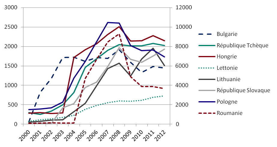 Notes : seuls les montants correspondant à la Bulgarie et la Pologne sont indiqués sur l’axe de droite.