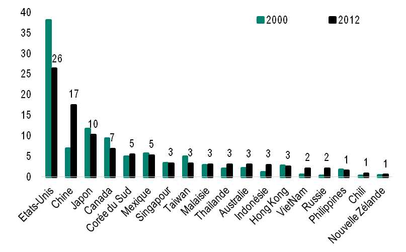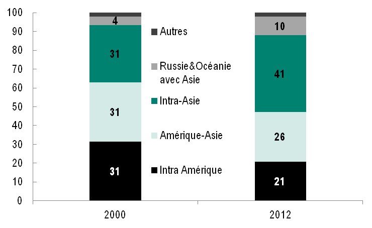 Le commerce entre les pays asiatiques a pris une place croissante (passant de 31 % à 41 % du total intra-régional entre 2000 et 2012), alors que le commerce entre pays de la façade américaine a reculé (de 31 % à 21 %). Globalement les échanges entre les deux rives du pacifique (américaine et asiatique) ont perdu du terrain (graphique 1).