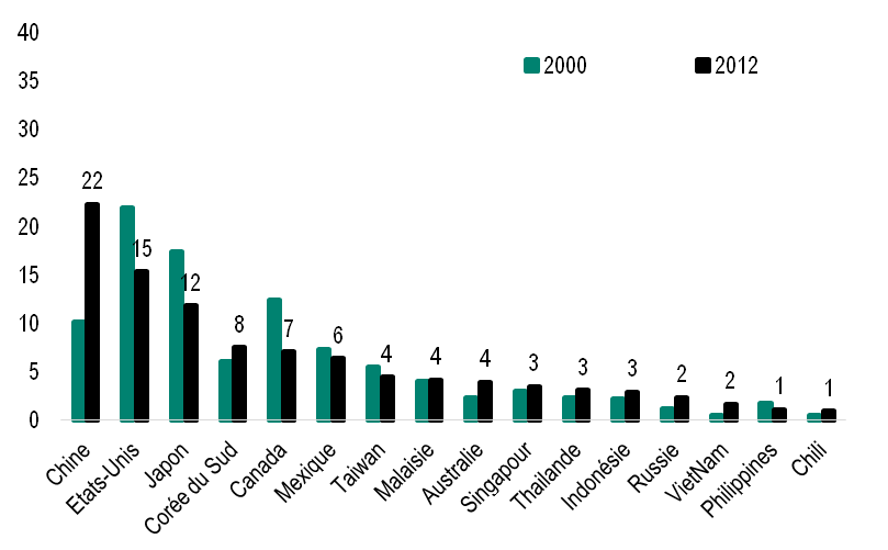 Ce basculement s’explique par le relatif recul des États-Unis dont le poids, encore prépondérant en 2000, a beaucoup diminué, passant de 22 % à 15 % des exportations intra-régionales et de 38 % à 26 % des importations ; et par l’avancée de la Chine, initialement peu présente, qui est devenue le premier exportateur dans la zone (22 % du total) (graphiques 2 et 3).