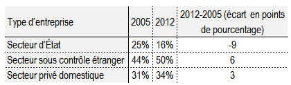Les firmes étrangères produisent, en 2012, 50 % du produit brut industriel du pays, part en augmentation depuis 2005 (tableau 1). Le secteur privé domestique est composé de très petites entreprises, souvent informelles, très sensibles aux restrictions de crédit ; leur contribution à l’activité diminue fortement durant les périodes de crise de paiement.