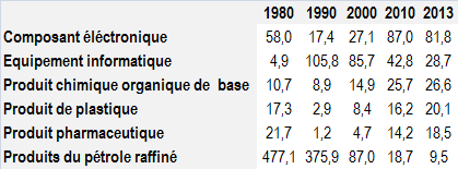 Singapour est aussi devenue le premier centre de raffinage pétrolier, de transport maritime et de réparation navale pour l’Asie du Sud-Est. Vers le milieu des années quatre vingt, Lee décide d’opérer une « révolution industrielle » en décourageant les industries de main d’œuvre, en augmentant les salaires pour les pousser à se délocaliser vers l’Indonésie. La part de l’industrie décline à l’exception du secteur électronique, au profit du secteur tertiaire. Singapour conserve cependant une activité centrale de réexportations de pièces et de composants de biens manufacturés, avec ou non un ajout de sa part. Le tout se traduit par un excédent commercial substantiel (64 milliards de dollars en 2013) qui est à la base de l’accumulation de ses ressources financières. Singapour se conçoit comme le centre d’accueil des technologies nouvelles qu’elle se propose de diffuser dans toute la région (voir tableau 1) : au lieu de développer sa propre industrie elle va jouer le soutien aux industries qui se développent dans les pays voisins. Elle devient le centre d’accueil des sièges des multinationales qui s’intéressent à la région et qui apprécient la stabilité politique et économique de la cité-état.