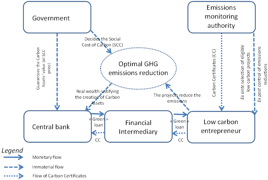 The European Central Bank announces that it is ready to refinance low carbon loans delivered by commercial and development banks up to the value of the effective emission reductions as certified ex post by the independent body. This comes down to making a new class of eligible carbon asset enter the ECB’s balance sheet. [1]