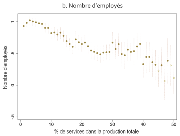 Ces effets révélés par l’analyse économétrique, notamment ceux sur le niveau d’emploi, peuvent étonner par leur ampleur, mais il est nécessaire de les relativiser. Ainsi, l’essentiel de notre échantillon est composé de PME et c’est surtout pour ces dernières que l’on observe un effet positif des stratégies de servitisation. Le nombre de salariés médian dans notre échantillon n’est que de 9. Une hausse de 30 % de l’emploi dans les entreprises qui se lancent dans la production de services correspond alors à la création de deux nouveaux emplois. Il faut aussi prendre garde à ne pas tirer hâtivement de conclusions macroéconomiques de ces résultats micro-économétriques qui ne prennent pas en compte les effets d’équilibre général (perte de compétitivité des entreprises industrielles non-servicifiées, intensification de la concurrence perçue par les entreprises de services, etc).