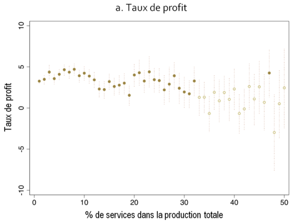 Le graphique 1 compare les taux de profits (en %) et le nombre d’employés (en logarithme) des entreprises « servicifiées » et des entreprises « purement industrielles ». Les graphiques montrent la différence de performance selon la part des services dans la production totale [5]. Le différentiel de performance apparaît clairement. Les entreprises servicifiées ont un taux de marge supérieur d’environs 3,5 points de pourcentage (soit, compte tenu du taux de marge moyen dans notre échantillon, une différence de plus de 7 %). En termes d’emploi, la différence est encore plus nette : les entreprises industrielles réalisant environs 10 % de leur chiffre d’affaire dans les services emploient en moyennes deux fois plus de salariés que les entreprises non-servicifiées.