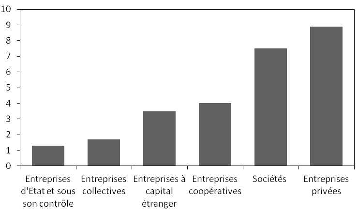Dans l’industrie, l’essoufflement de la production s’est accompagné d’une baisse des prix à la production manufacturière (-5,9% au cours des 9 premiers mois 2015 par rapport à la même période de l’année précédente) et d’une chute des profits (-1,7%). Les résultats sont inégaux selon les secteurs, certains tirant assez bien leur épingle du jeu (industries du recyclage, de la chimie et de la pharmacie, de l’électronique), alors que d’autres subissent de plein fouet le ralentissement de la demande interne (mines, machines, automobiles). Une tendance ressort nettement : le ralentissement industriel affaiblit les entreprises d’État qui souffrent notamment de leur positionnement sur les secteurs en récession (industries lourdes). Leur production augmente à peine (moins de 2%) et elles continuent de compter une très forte proportion d’entreprises déficitaires (35% en 2015 comme en 2014). En revanche, les entreprises privées (ainsi que les sociétés à responsabilité limitée) se révèlent relativement résilientes, avec une croissance de leur production (autour de 8%) quatre fois plus rapide que celle du secteur d’État (Graphique 1). Les entreprises à capital étranger enregistrent une croissance relativement faible de leur production, qui s’explique sans doute par leur orientation à l’exportation et leur positionnement sur l’automobile. Le secteur non étatique est largement majoritaire dans l’emploi comme dans la production manufacturière et c’est sur lui que repose l’avenir de la croissance industrielle du pays [1].