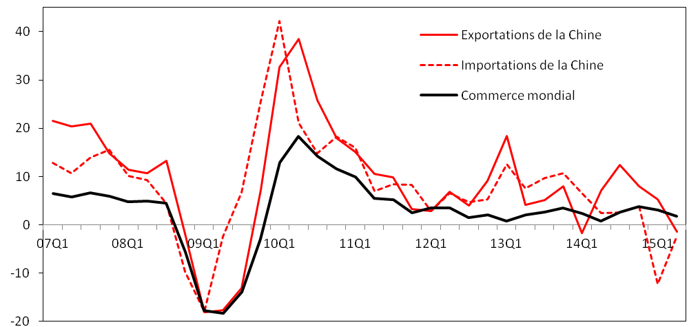 Graphique 2 : Variation du volume du commerce de la Chine et du monde (% par rapport au trimestre de l'année précédente)