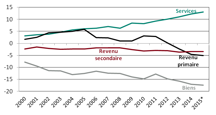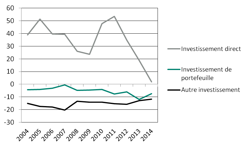 En revanche, le déficit des revenus de portefeuille s’accentue sensiblement, en même temps que l’excédent des revenus des investissements directs, important jusqu’en 2011 (3,3 % du PIB), disparaît (0,1 % en 2014).