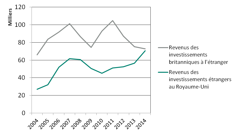 On pourrait également assister à une substitution dans l’investissement direct britannique à l’étranger entre banques et institutions financières non monétaires (fonds d’investissement entre autres). Alors que les revenus d’investissements à l’étranger des premières déclinent de 13% (de 6,3 à 5,5 milliards de livres), les secondes augmentent les leurs de 60% (de 6,9 à 11 milliards) entre 2011 et 2014.