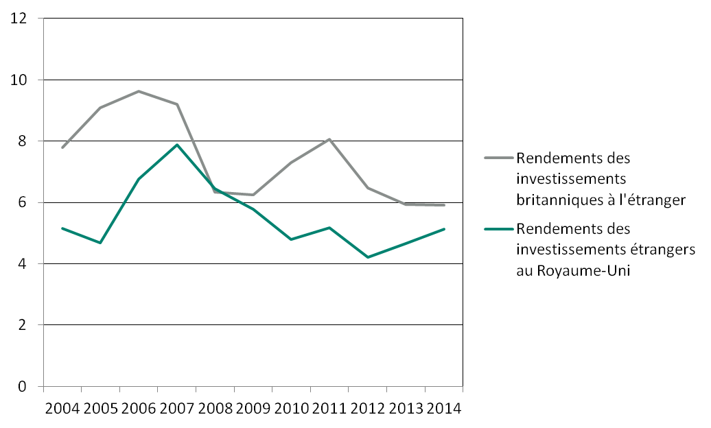 Source : Office for National Statistics, The Pink Book 2015. Note: rendement apparent = revenus / stocks d‘investissements en fin d’année. Les stocks comprennent les effets de valorisation liés aux variations de change et de prix. |