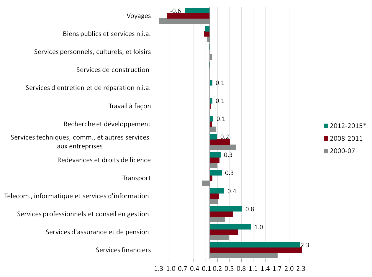 La répartition des excédents britanniques dans les services indique que les services financiers, les services d’assurance et de pension, les services professionnels et de conseil en gestion, les télécommunications, l’informatique et les services d’information contribuent à l’essentiel du commerce des services (graphique 5). Quasiment tous ces postes de services augmentent leurs excédents ou réduisent leurs déficits. L’excédent courant combiné des services financiers et des services d’assurance et de pension représente à lui-seul 3,3 % du PIB sur la période 2012-2015 (graphique 5).