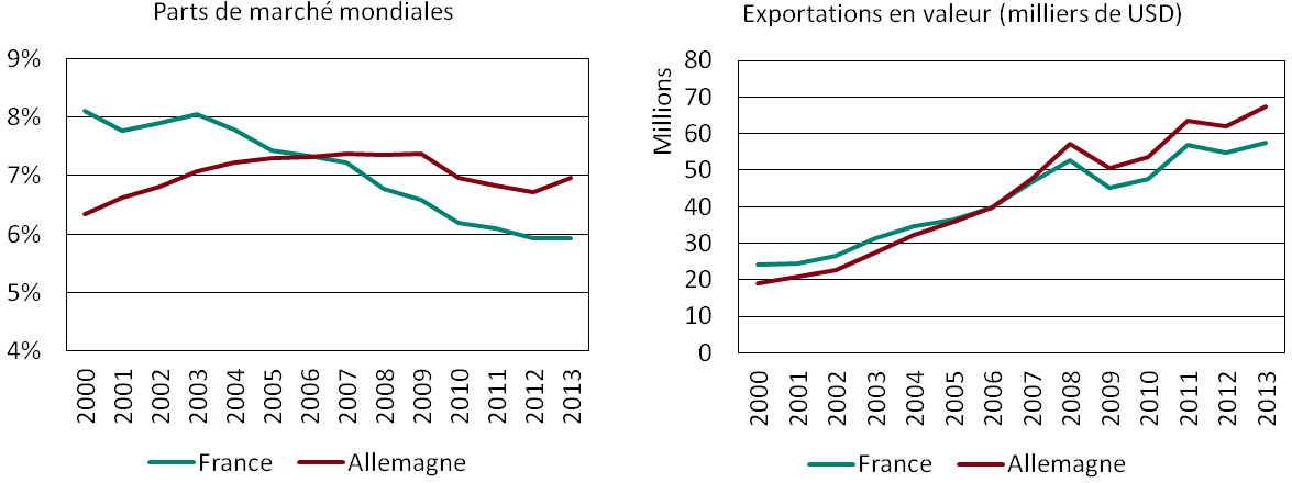 Dans les secteurs agricole et alimentaire, la part de marché mondiale de la France a reculé de 8,1 % en 2000 à 5,9 % en 2013, celle de l’Allemagne a augmenté de 6,3 % à 7 % (graphique 1). Les exportations de produits agricoles et alimentaires ont augmenté en valeur dans les deux pays, mais nettement plus en Allemagne (257 %) qu’en France (138 %). Cette différence peut-elle s’expliquer par la spécialisation des deux pays ?