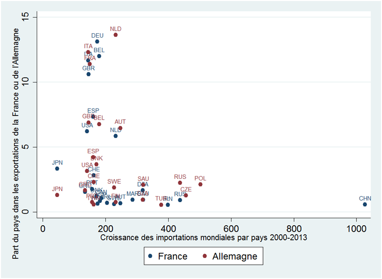 Note de lecture : les Pays-Bas (NLD) ont vu leurs importations croître de plus de 200 % entre 2000 et 2013. Le pays représentait 14 % des exportations allemandes, il ne représentait que 6 % des exportations françaises. |