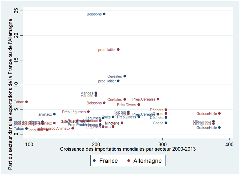 Le graphique 3.b reprend les mêmes statistiques que le graphique 3.a, mais au niveau sectoriel. Le secteur des boissons, qui représente plus de 24 % des exportations agricoles et alimentaires de la France, a connu une croissance de 212 % sur 2000-2013, à lui seul il explique une part importante de la hausse des exportations françaises. La demande de céréales (12,8 % des exportations françaises) a également fait l’objet d’une hausse de 240 %. Ce sont toutefois les graisses, huiles et oléagineux qui ont connu la plus forte hausse de leur commerce mondial (+ 385 %), ce qui a été favorable aux deux pays, en particulier à l’Allemagne dont les exportations d’huiles et graisse représentaient 4,3 % des exportations en 2000. De même, la hausse de demande des produits transformés (à base de céréales, de cacao) ainsi que des déchets a été plus bénéfique à l’Allemagne pour qui ces secteurs représentaient une part plus élevée du commerce en début de période. Il est à noter également que le dynamisme de la demande des produits laitiers dont le commerce mondial a augmenté de 233 % a encore une fois davantage profité à l’Allemagne pour qui ce secteur constitue une part importante des exportations (17 %) qu’à la France, où il représente 11 % des exports.